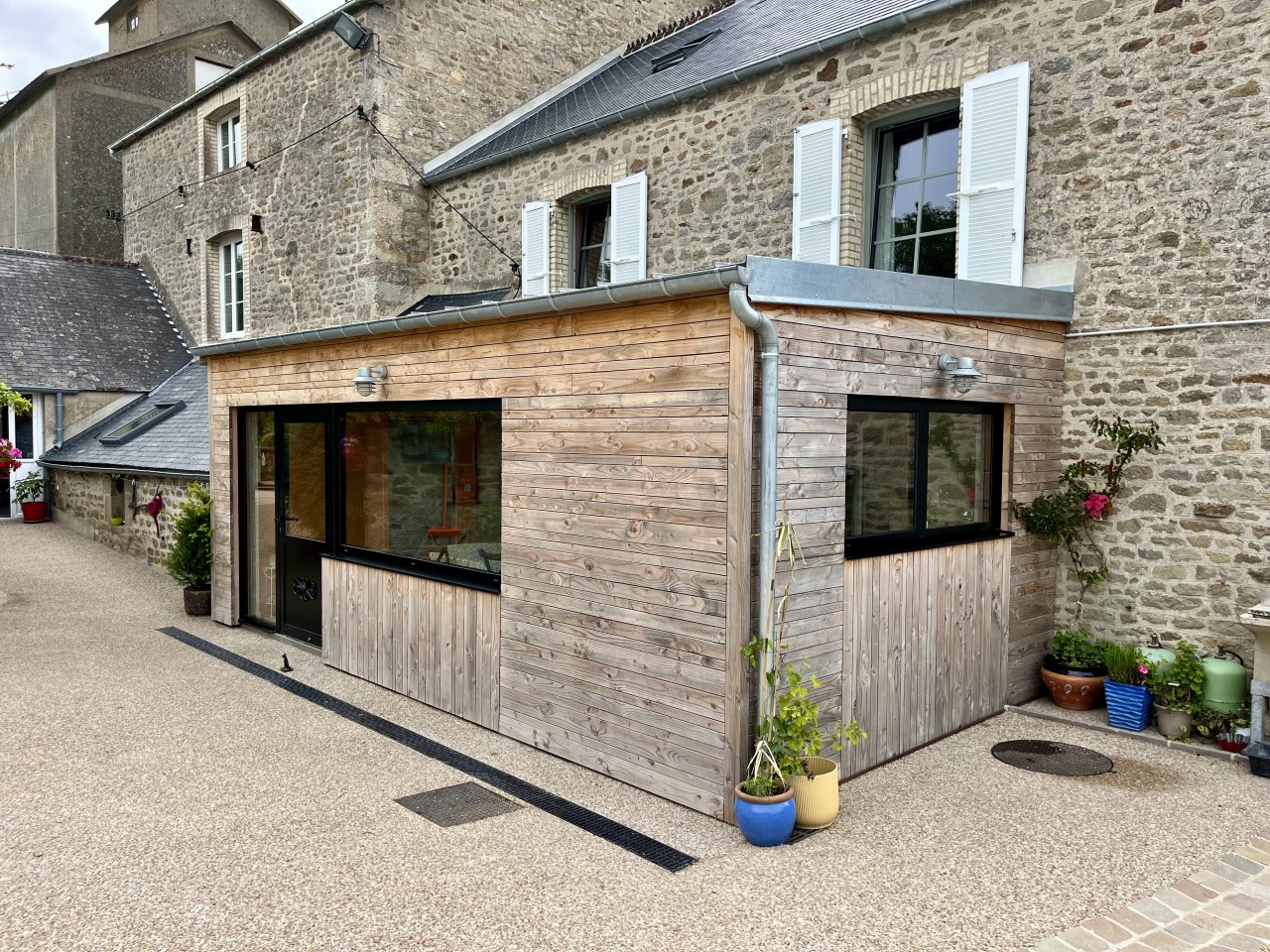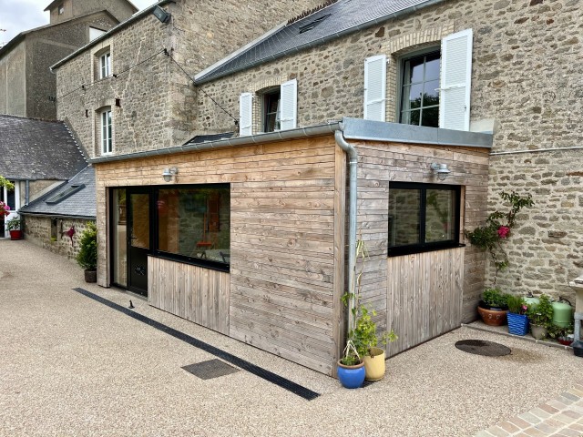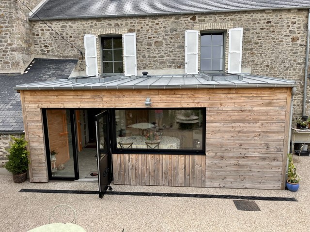 Travaux : Ossature bois • toiture • bardage • menuiseries aluminium (extension et façade) • isolation • revêtements de finition • peinture • mobilier.